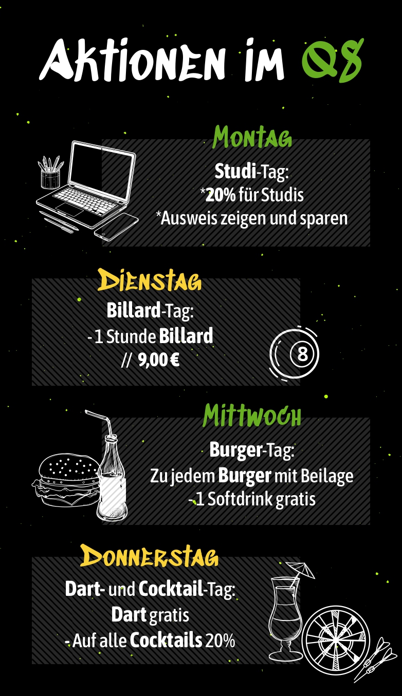 In this lively atmosphere, where the joy of the game is combined with culinary highlights, we create unforgettable experiences. Every smile from our team, every freshly prepared meal and every exciting match underlines our dedication. The Q8 Sportslounge is more than just a bar – it’s a home for anyone looking for relaxation and entertainment in one.
